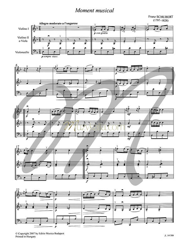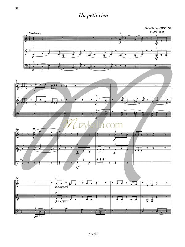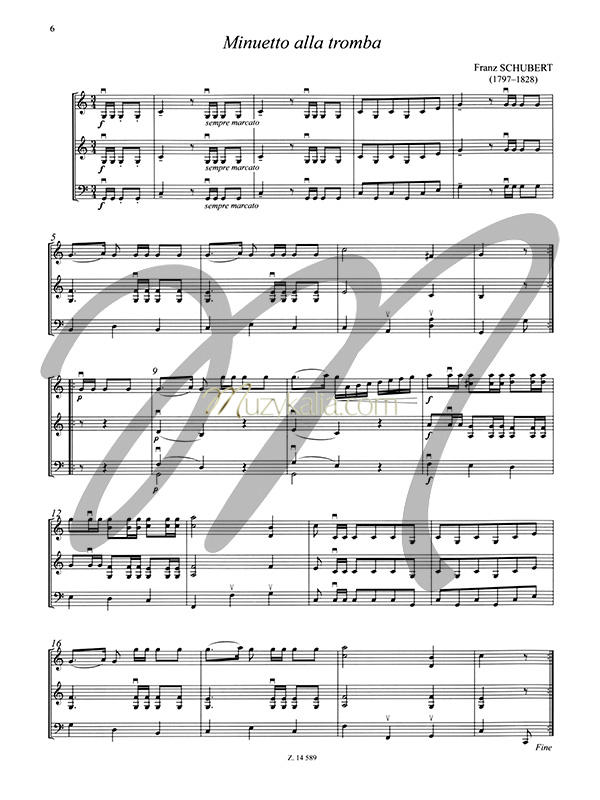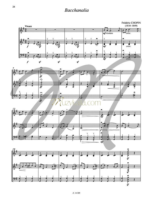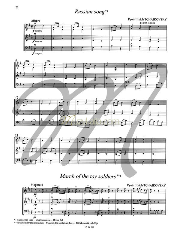 ![]() Poziom trudności: Łatwy, Średniozaawansowany - co to znaczy Zbiór 20 łatwych kompozycji na trio smyczkowe (partia II skrzypiec może być grana wymiennie z altówką) możliwych do wykonywania przez uczniów w początkowych klasach szkoły muzycznej I stopnia. Palcowanie obejmuje wyłącznie pierwszą pozycję. Wśród utworów znalazły się kompozycje wielkich romantyków, m.in. Fryderyka Chopina, Franza Schuberta, Piotra Czajkowskiego, Edvarda Griega.